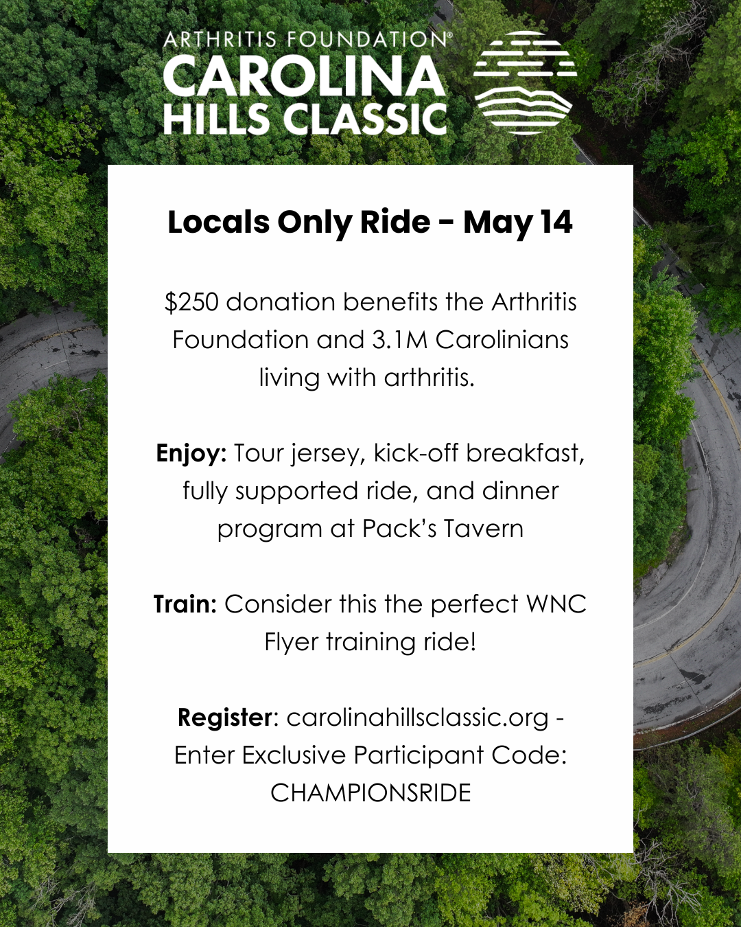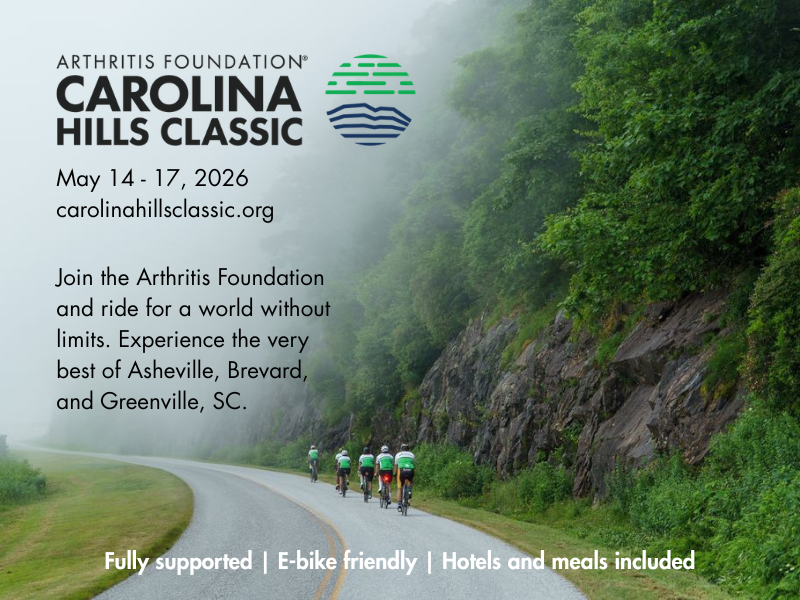 Join us in a mecca for cycling, May 14-17, 2026, and experience first-hand why Asheville, N.C., and Greenville, S.C. were both named one of the "Best Road Cycling Weekend Getaways in North America" by Velo Powered by Outside.